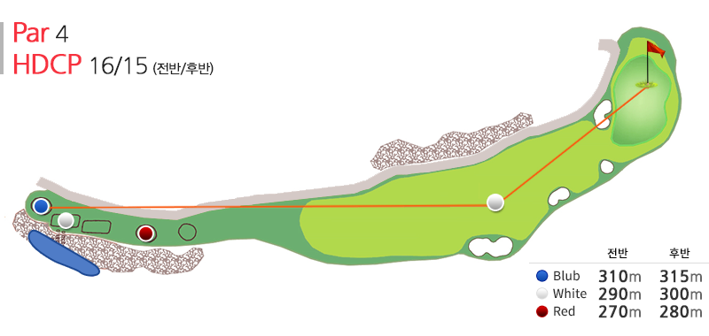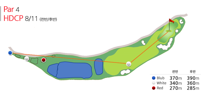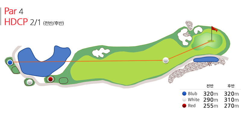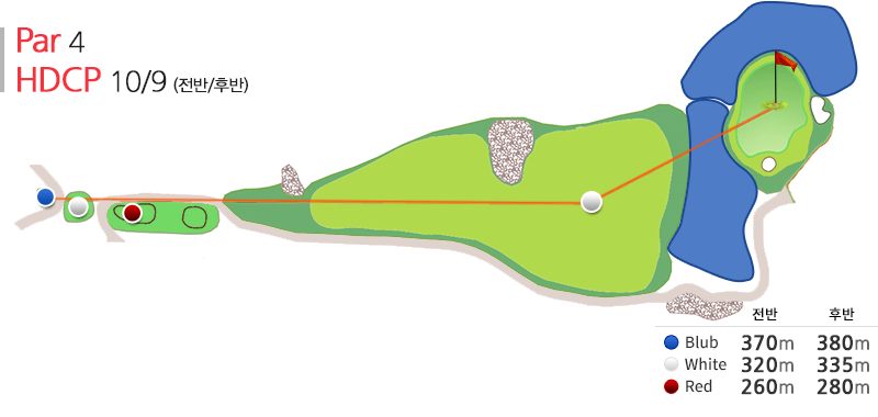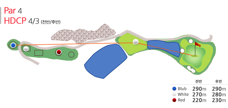 par4의 홀로 전략적인 선택을 한 골퍼에게 160~180m의 샷을 안정적으로 구사할 자신이 없는 경우 어쩔 수 없이 드라이버로 공략하는 도전 정신을 요구하도록 설계된 코스이다.