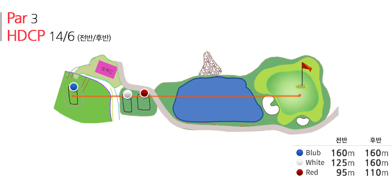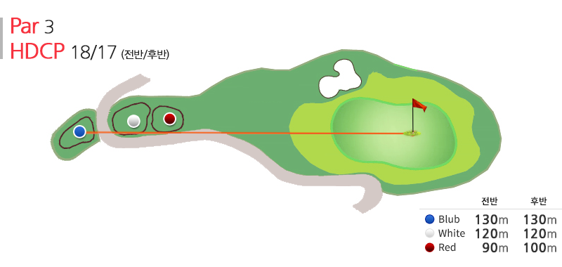 짧은 par3 홀이지만 아마추어 골퍼로 하여금 PIN을 공략하지 않고 주변 마운드를 공략해 홀컵에 접근 시키는 요령을 습득 할 수 있도록 조성된 코스이다.