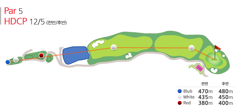 par5홀로 호쾌한 티샷과 200~220m의 세컨샷이면 무난하게 투온이 가능하고 버디를 노려 볼 만하다. fairway에서 360° 절경을 감상하며 여유를 가져 볼 만하다.