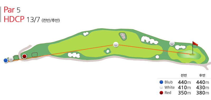 par5의 오르막 홀로 넓은 fairway를 2단으로 배치하여 상단에서 공략시 실제 거리감을 느낄 수 있으나 하단에서 그린 공략시 실제보다 20~30m이상 멀어 보이도록 조형을 한 코스로 코스 조형의 깊이를 느낄 수 있는 코스다.